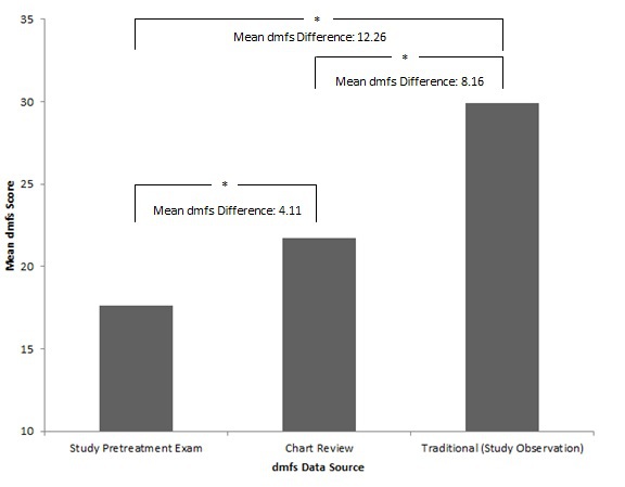 Objectives: The traditional decayed, missing, and filled surfaces (dmfs) system for counting dental caries assumes all surfaces of crowned and missing teeth are affected. The current study used a case series to compare the traditional counting mechanism with modified dmfs scores based on actual counts of dental caries from pretreatment study visits and treatment records to determine if disease overestimation exists in observational research. Methods: Infants in this longitudinal IRB-approved study were recruited from Perry County, Alabama, a high-caries risk community because of their low socioeconomic status and minority (African American) population. Descriptive characteristics were determined from baseline questionnaires. Dental caries data were collected via visual oral exams every twelve months for sixty months. Children with complete follow-up and at least one crown or extraction due to dental caries were eligible to be included in this case series (N = 45). Records of dental care of treating dentists were reviewed to quantify the actual number of tooth surfaces affected by dental caries before treatment; 19 charts were chart-reviewable. Actual dental caries counts for 54 teeth were used to create two modified dmfs score outcomes: chart review (i.e., treatment records) and study pretreatment exam (i.e., study visit immediately preceding treatment). Differences between traditional and two modified dmfs scores were evaluated by Wilcoxon Signed Rank Tests, using a Bonferroni-corrected α = 0.017. Results: While traditional dmfs scores significantly overestimated the actual measure (i.e. chart review) of disease (p < 0.0001), pretreatment data significantly underestimated actual (p = 0.0005) and traditional (p < 0.0001) methodologies of dental caries counts at sixty months (Figure 1). Conclusions: This case series provided evidence contradicting the assumption that all five surfaces of crowned or extracted primary teeth are affected. Traditional scoring overemphasized caries while pretreatment values were too conservative, suggesting the need for the development of a chart review-based, modified score.