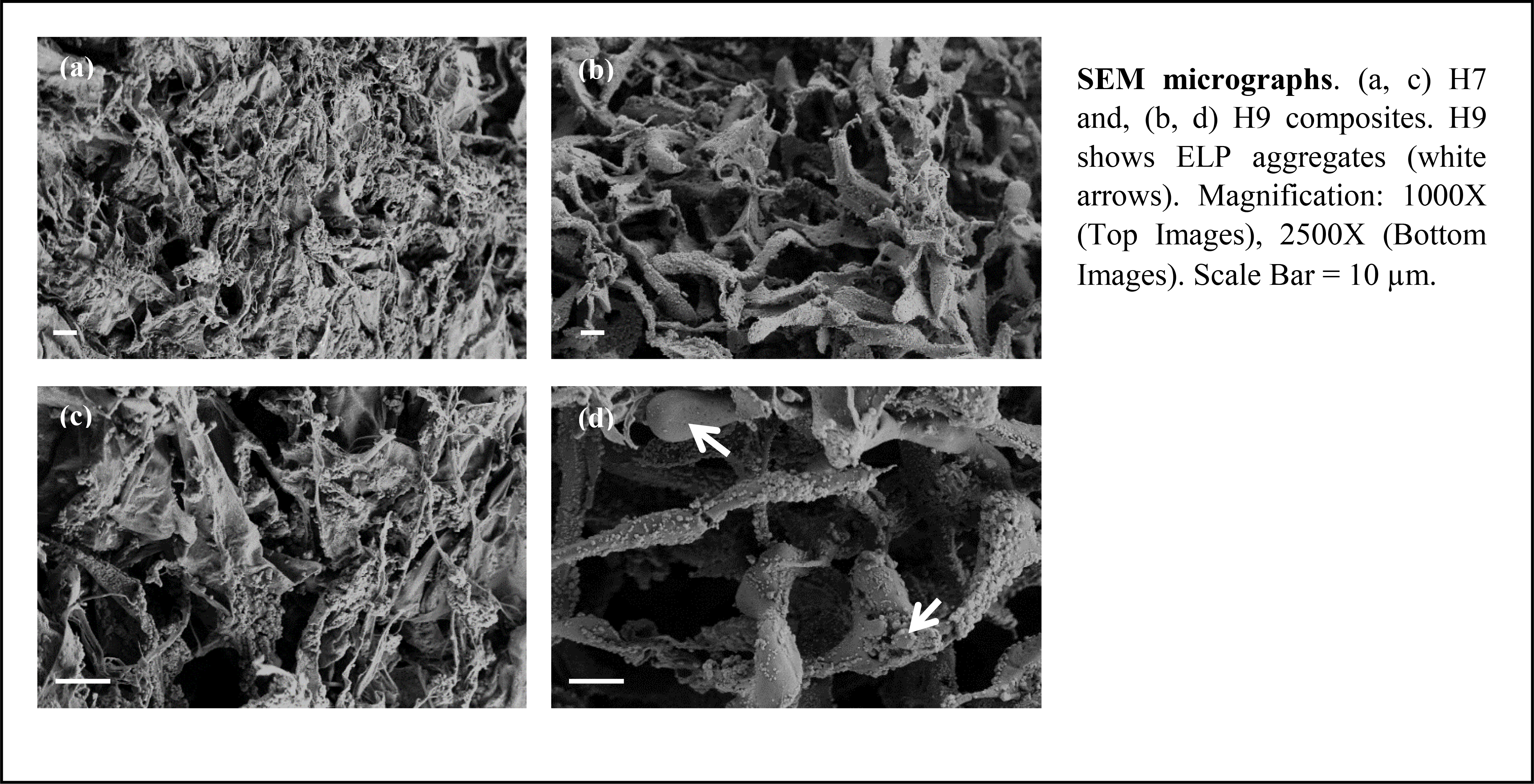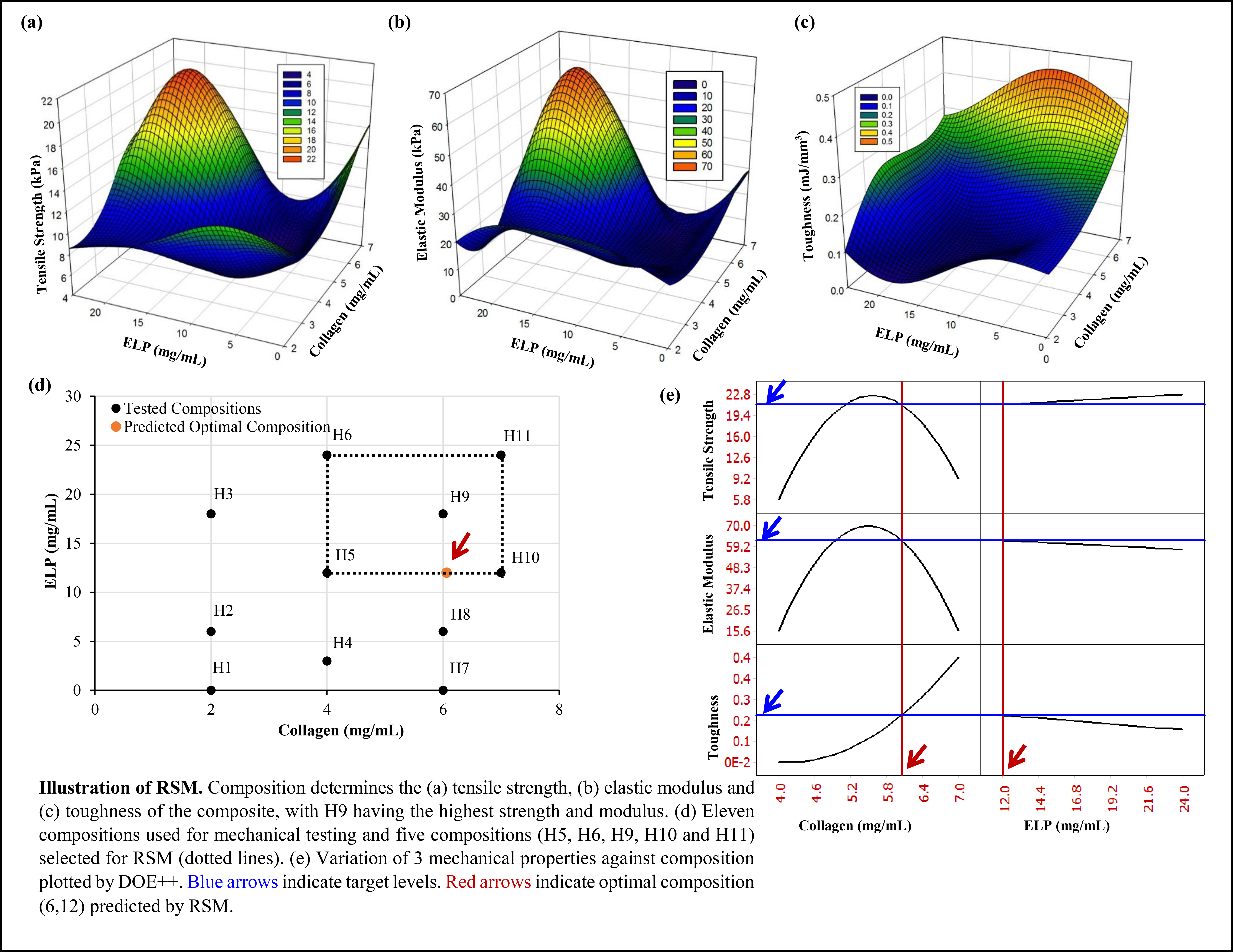 Objectives: Collagen scaffolds for guided bone regeneration have poor mechanical properties and fail due to lack of rigidity and rapid degradation by collagenases. The objectives of this study were to reinforce collagen with elastin-like polypeptide (ELP) and optimize composite mechanical properties using novel response surface methodology (RSM). Methods: 2-7mg/mL collagen and 0-24mg/mL ELP were used in 11 different proportions to form the composites (Fig.1). Tensile strength, elastic modulus and toughness of hydrated composites were determined by uniaxial tensile testing (n=6) and optimized by two factor (collagen/ELP concentration) analysis with RSM (DOE++ software). Composites (n=3) were characterized by swelling ratio, differential scanning calorimetry (DSC), scanning electron microscopy (SEM) and FTIR spectroscopy. Results: Mechanical properties varied with composition (Fig.1a,b,c). H9 composite had the maximum strength (20.2±11.3kPa) and modulus (61.8±22.7kPa), but had lower toughness (0.20±0.04mJ/mm3) than many other composites. The efficient RSM technique performed equally weighted two-factor, three-objective optimization using just 5 compositions (versus the 11 we had to prepare for Fig.1a,b,c) and directed us to 6:12mg/mL collagen:ELP composition that may have high toughness without negatively impacting strength and modulus (Fig.1d,e). Physical characterization of freeze-dried H9 composite against its control (H7) by swelling ratio, DSC, and FTIR revealed that the addition of ELP in composites reduced the residual water content (swelling ratio for H7=53.8±3.7 versus H9=30.8±2.1). SEM images of both H7 (Fig.2a,c) and H9 (Fig.2b,d) composites showed porous fibrillar and afibrillar collagenous microstructure. Additionally, H9 composite showed dense microstructure with characteristic ELP aggregates. Conclusions: A biomaterial with suboptimal properties should be optimized by a compromise between the minimal requirements, target level, and relative importance of each property. RSM efficiently performed such optimization for ELP-collagen composites and predicted a new composition for future testing. Our study demonstrated that ELP-Collagen composites have the capability to form good quality, rigid porous structures required for guided bone regeneration.