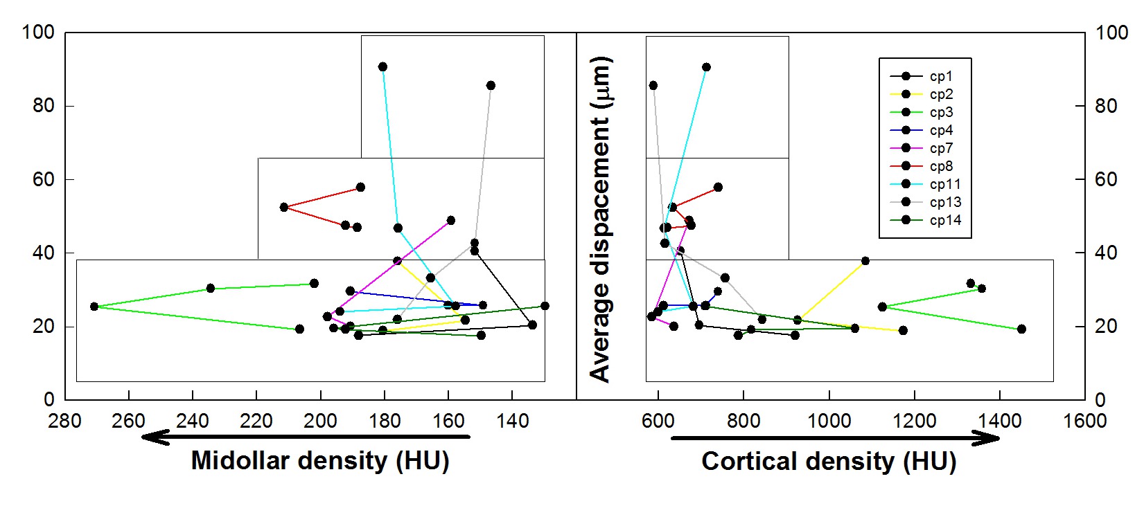 Objectives: The importance of the primary stability is widely acknowledged defined as the absence of micromovements larger than 75-100 µm. Unfortunately, there are no means to detect accurately micromotions in the clinical field, whereas ex vivo samples allow the precise detection through mechanical instrumentation. The success of the adaptation (osteointegration) depends on several factors, including the density and dimension of the host bone, the implant geometry, the surgical technique and peak insertion torque. Thus, in clinical practice, estimates of the primary stability come from detections of bone properties and insertional torque. The statistical relevance of these indirect measurements is still under debate. Methods: More than 50 implants (BTK bt safe Bone level) were inserted in fresh pig-bone ribs from the same animal; insertional torque was recorded by a digital dynamometric wrench. Each rib was previously examined radiographically through the use of CBCT-TAC to assess cortical and medullary thickness and to evaluate bone density through the attenuation of gray (Hounsfield units). The implants were subjected to five repeated cycles of lateral load up to 5 N using a Zwick-Roell machine and for each implant an average displacement was detected. Results: In each ribs, the cortical and medullary bone densities around the implant and the torque and micromotions under 5 N load were measured. The micromovements observed under uniform applied load are investigated as function of the cortical and medullary densities as reported below. These results are in close agreement with the scientific literature knowledge on the firm influence of cortical bone density in ensuring better implant fixity. Concerning the insertional torque, strong correlation of insertional torque above 80 Ncm with micromovements demonstrates that excessively high insertional torque increase micromovements depletes primary stability. Conclusions: Primary stability is shown to depend essentially on cortical density; high insertional torque depletes implant fixity increasing micromovements. The possible routes to overcome present instrumentation limitations are discussed.