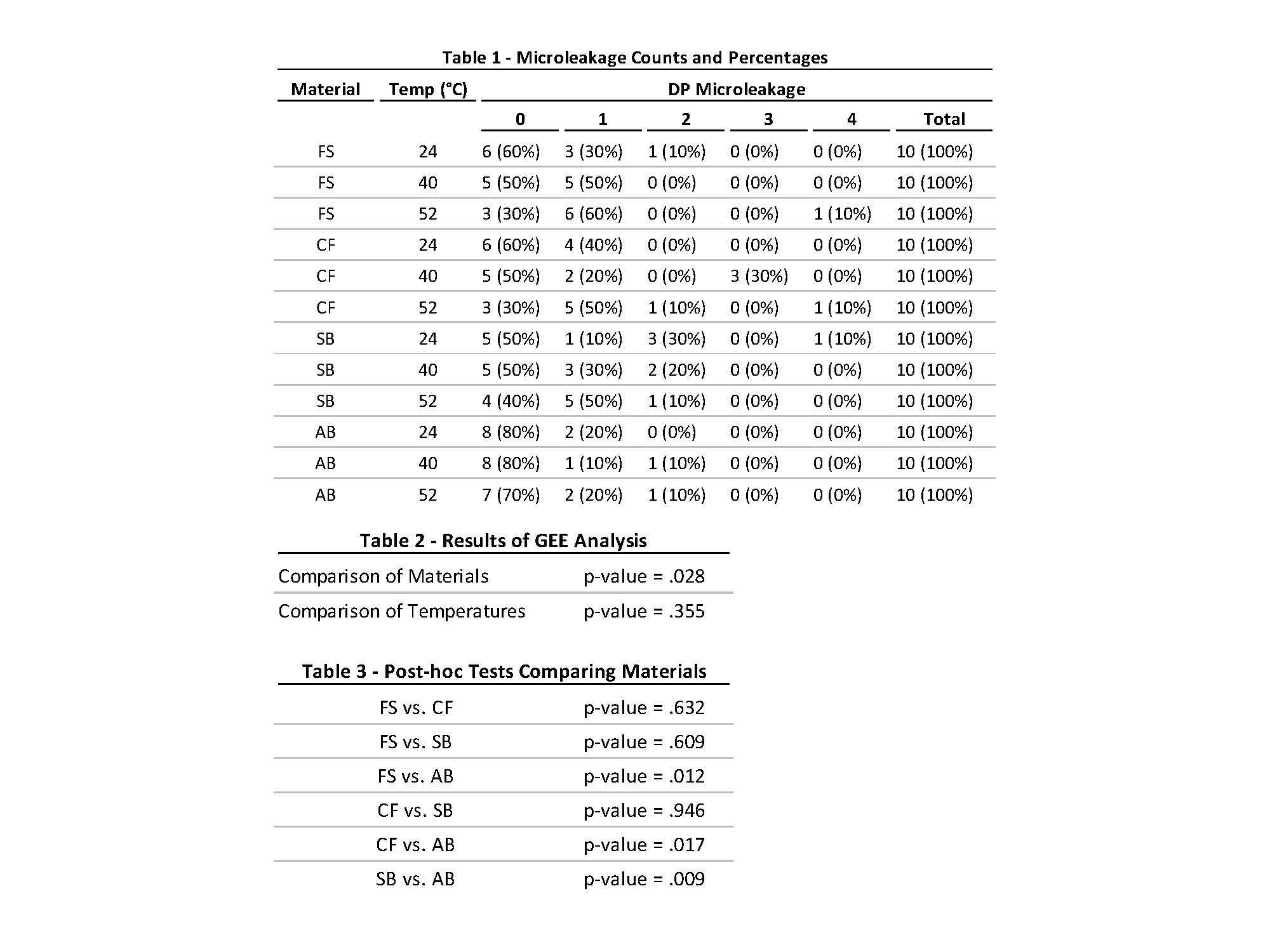 Objectives: Compare marginal microleakage across three different generations of bonding agents after heating the materials prior to placement. Adjusting the delivery and storage of materials that were exposed to prolonged high temperatures before application may compromise their restorative properties. Methods: Standard Class II slot preparations (120) were performed on non-carious human molars with approximately 3mm depth at gingival floor and 4mm width bucco-lingually. Samples were randomly assigned into 12 groups (n=10). Three bonding agents were tested: ExciTE® F Ivoclar Vivadent (EF), CLEARFILTM SE Bond Kurary Dental (CF), and ScotchbondTM Universal Adhesive 3M ESPE (SB). ACTIVATM BioACTIVE Restorative Pulpdent (AB), was tested for additional comparisons. Materials were placed in an incubator (Thermo ScientificTM, ELED265) and heated for 120 hours at either 24°C, 40°C, or 52°C. All materials were applied according to manufacturer’s instructions. FiltekTM Supreme Ultra composite 3M ESPE was placed on bonding agents. Completed restorations were thermocycled for 5,000 cycles with dwell time of 15 seconds between 5°C and 55°C. Samples were immersed in 2% methylene blue dye for 8 hours, embedded in acrylic resin, sectioned mesio-distally, and evaluated under stereomicroscope (Olympus, SZX16). A dye-penetration-to-axial-wall (DP) score was used on gingival floor: 0=0% DP, 1=1-25% DP, 2=26-50% DP, 3=51-75% DP, and 4=76-100% DP. Counts and percentages were calculated, and statistical significance was assessed via generalized estimating equations (GEE) for separate comparisons of materials and temperatures. Results: Table 1 displays counts and percentages of microleakage scores. Table 2 displays GEE analysis showing statistically significant difference (p<0.05) between materials. Table 3 displays post-hoc tests using Bonferroni correction to adjust for multiple comparisons (p<0.008). All comparisons with AB would have been significant at p<0.05, but no comparisons were found significant using Bonferroni correction. Conclusions: Results suggest that there are differences in microleakage between adhesive systems, but no definitive conclusions could be drawn from gathered data.