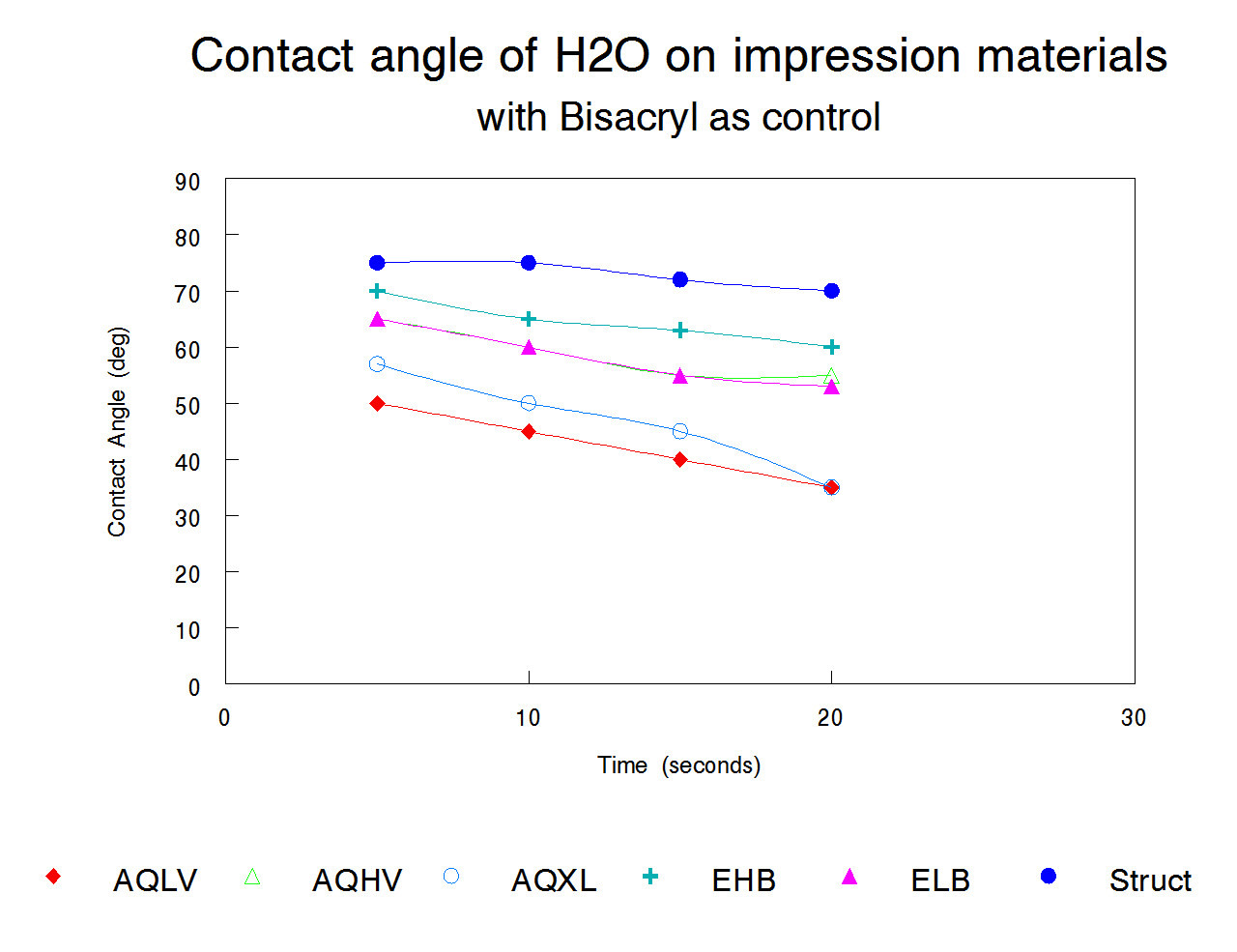 Objectives: To measure and compare the contact angle of water on two different impression materials; vinyl polysilicone (VPS) and vinyl polyether silicone (VPES). A bisacryl composite for provisional restorations was used as a non- silicone reference material. Methods: The following impression materials were measured. VPS materials, Aquasil Ultra LV (AQLV), Heavy (AQH), and XLV (AQXLV)) (Dentsply/Caulk) . VPES materials: EXA’lence Light body (ELB) and Heavy body (EHB) (GC America). A bisacryl composite was used as a non-silicone material , Structur Premium A3 ( Voco). Each material specimen was made from a small circular mold of 25mm diameter and 18 mm thick. Each specimen was placed into a Ramé-Hart Drop Image Goniometer. One drop of water was dispensed on the surface, and an initial image was captured. After 15 seconds, another image was captured and repeated for a total of 4 images per material. The contact angle for each image was measured using a hand held protractor for initial angle measurements. Results: A graph was generated to show the different contact angles of each material over time. (Figure 1) As the drop expands over time, the drop diameter increased, creating an advancing contact angle. This trend was the seen for all impression material. Conclusions: Advancing contact angle is lower than the initial contact angle over time. We see this phenomenon in all impression material. There were no significant angle differences between the vinyl silicon vs vinyl polyether silicon based blend. The reduction in advancing contact angle was less for the bisacryl material.