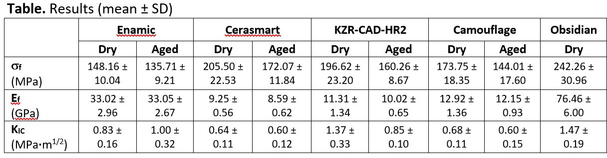 Objectives: The development and introduction in the market of resin-composite (RC) CAD-CAM block has been rapidly evolving. However, independent assessment of their mechanical properties remains scarce, representing a challenge for clinicians who wish to base selection of materials on evidence. Objective: The aim of this study was to determine and compare the fracture toughness (KIC), flexural strength (σf) and modulus (Ef) of four commercially-available RC and one lithium disilicate glass-ceramic CAD/CAM block, tested under dry and aged conditions. Methods: Methods: Four RC, Vita Enamic (VE), Cerasmart (CER), KZR-CAD-HR2 (KZR), and CAMouflage Now (CAM), along with Obsidian (OBS), a glass-ceramic, were characterized. Blocks were cut into bars (10:1 span to thickness ratio) and [(6x6x6x12) mm)] prisms (n=25/group); half of RC specimens were aged in 37°C distilled water for 30 days before testing. σf and Ef were determined through a three-point bending test, whereas KIC using the notchless triangular prism specimen KIC test. Fractured KIC surfaces were characterized with scanning electron microscope. Results were analyzed by Weibull statistics and two-way ANOVA, followed by Scheffé multiple mean comparisons (α=0.05). Results: Results: The results are summarized in Table. With regards to σf, OBS>CER=KZR>CAM>VE; σf of RC was lowered by ageing. VE was found to have the highest Ef among RC (33.0GPa), but significantly lower than OBS (76.5GPa); Ef was not affected by ageing. With regards to KIC, KZR stood out among RC with a dry value of 1.4MPa●m1/2, which was significantly affected by ageing while KIC of the other RC was not. OBS had the highest KIC (1.5MPa●m1/2). Conclusions: Conclusions: The mechanical properties of the tested materials differed and the impact of ageing on σf of RC materials was found to be significant. Overall, the tested ceramic CAD/CAM block exhibited superior mechanical properties that may better suit clinical application.
