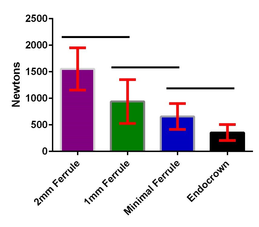 Objectives: To evaluate the fracture resistance of endodontically treated molars restored with the Endocrown technique versus composite cores with various level of ferrule. Methods: 48 recently extracted human molars were endodontically accessed, pulp chamber debrided and canals instrumented by a board certified endodontist. Teeth were embedded in acrylic and randomly divided into 4 groups. 1 Endocrown group; 2mm pulp chamber extension design. 3 composite core groups: 2mm ferrule, 1mm ferrule, 0mm ferrule. Composite Cores placed according to assigned group and manufacturer instructions (ClearFil DC Bond and ClearFil DC Core Plus, Kuraray). After 24 hrs, all teeth were prepared to either 2mm, 1mm, 0mm ferrule or Endocrown preparation designs. Preparation surface area was determined using a digital microscope (Hirox). An acrylic scanning jig, maxillary left quadrant, was made with an opening in area of 1st molar. Each tooth specimen was then placed within the 1st molar position of scanning jig and digitally captured with CEREC OmniCam. CEREC crowns were designed using “Biogeneric Copy” of a standard waxing. Lithium disilicate crowns were milled, crystallized, intaglio surfaces etched and coupling agent applied according to manufacturer instructions (e.max CAD, IPS Ceramic Etching Gel, Monobond Plus; Ivoclar Vivadent). Tooth preparations were cleansed with a pumice/water slurry. Crowns were cemented with a self-adhesive resin cement (RelyX Unicem2, 3M ESPE). After 24 hours, specimens were loaded to failure on a universal testing machine (MTS Alliance RT-5); piston loaded on buccal cusps, 45 degrees to long axis of tooth, rate 0.5 mm/min. Peak Force (Newtons) recorded and failure stress (MPa) calculated based on preparation surface area. Data analyzed using Kruskal-Wallis/Dunn’s post hoc (p=0.05) Results: Graphs attached. Conclusions: Under this study’s conditions, Endocrown failures were less likely to be catastrophic, yet failed at a lower force than 1mm & 2mm ferrule groups.