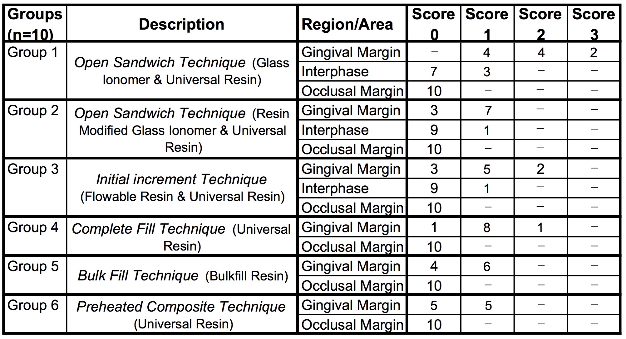 Objectives: It is a challenge to achieve successful marginal seal in deep,subgingival Class-II restorations. The aim of this in-vitro study was to evaluate the microleakage in gingival(cementum) and occlusal(enamel) cavosurface-margins of resin restorations using Open-Sandwich(OST), Bulk-fill and Preheated-composite techniques. Additionally, the interphase between resin and the initial layer as glass-inomer(GI), resin-modified-glass-ionomer(RMGI) and flowable-composite(FC) was evaluated Methods: A total of 60 extracted sound-human-molars were used to prepare Class-II slot preparations(flat occlusal, 3x2mm box, 1mm gingival-floor,1mm below CEJ). Six study groups(n=10) included OST using universal-resin(Filtek-Supreme-Ultra) with GI(Fuji-IX)(Gr 1), OST with RMGI(Fuji-II)(Gr2), universal-resin with initial FC layering(Filtek-Supreme-Ultra-Flow)(Gr3), complete-fill(incrementally-cured) universal-resin(Gr4), Bulk-fill composite(Filtek Bulk-Fill)(Gr5) and preheated-composite(Calset-Tritray/heater)(Gr6). After the restorations, all samples were stored in 37°C water for 24hrs(Isotemp/Incubator) and thermocycled for 1500 cycles(5-55°C, 1min dwell-time). Teeth were sealed at the apices, coated with two-applications of nail varnish(1mm from the margins) and immersed in a freshly prepared 1%methylene blue solution(pH 7.0)(Icca) for 4hrs(37°C), then washed with water. Samples were fully embedded in clear-acrylic(Orthojet) using 10x10mm moulds to prevent sample-loss during sectioning. Teeth inside the acrylic blocks were sectioned vertically(1mm intervals) using a slow diamond saw(Isomet). All samples were evaluated under a digital light microscope(Olympus SZX7,40x) and were scored for microleakage(0=No dye penetration;1=up to 1/3 wall;2= up to 2/3 of wall;3= more than 2/3 wall). Results were statistically evaluated using Fisher’s Exact Test. Results: OST using conventional-GI showed the most amount of microleakage in the subgingival-margins and the interphase(p<0.001). Bulk -fill and preheated-composite techniques showed better results compared to other groups but data was not statistically different between groups 2-6. All techniques performed well on enamel(occlusal). Conclusions: OST technique using conventional-GI caused more microleakage in subgingival Class-II restorations. All other techniques performed similarly.