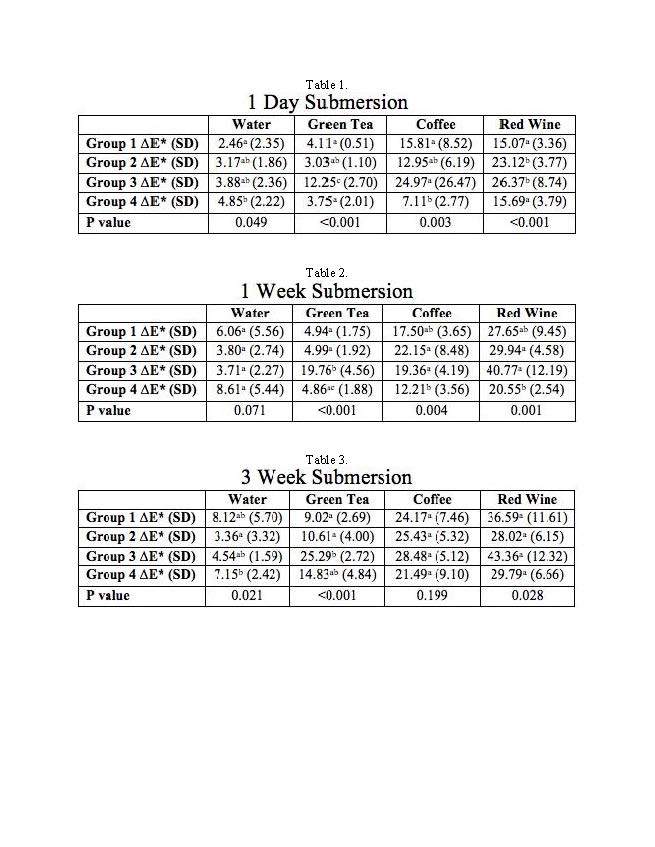 Objectives: Investigate staining potential on composites from short and long-term exposure to green tea, coffee, red wine, and water. Methods: 144 disc-shaped specimens, measuring 8x2mm, were prepared using 4 groups of composites (n=36): Group 1: Bioactive Flowable Composite with MCP (Pulpdent); Group 2: Filtek™ Supreme Ultra (3M); Group 3: Fuji II LC® (GC America); and Group 4: Beautifil II® (Shofu). Materials were prepared and cured (DEMI™, Kerr) according to manufacturer’s instructions. All samples were wet-ground polished (EcoMet™250, Buehler) sequentially from coarse to smooth grit with final polishing done at 600 grit. Baseline color coordinates (L*, a*, b*) were then obtained and recorded using an Olympus Crystaleye Spectrophotometer. Samples from each group were submerged in each liquid for 3 weeks (n=9 per liquid). Color coordinates were taken after submersion for 1 day, 1 week, and 3 weeks. Changes in color (ΔE*) after each period were calculated using the baseline value as a reference. Results: ΔE* tended to increase with length of submersion. There were statistically significant differences between groups, which depended on the beverage and length of submersion (see Tables 1-3). Results showed almost no significant differences in staining amongst the four groups after submersion in water over each period. Conclusions: All the materials in this study displayed clinically unacceptable color changes at all times in red wine (ΔE* >8). Group 3 underwent the most color change after three weeks of submersion over time.