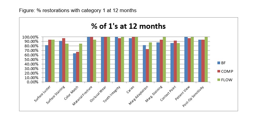 Objectives: Traditionally resin restorations have been placed in 2 mm increments, recently a flowable resin composite has developed to be placed and cured in 4mm increments. This 1 year report of a 3 year study compares the clinical success of 3 composites (2 incrementally cured and 1 bulk cured) in posterior restorations. Methods: 40 subjects were recruited needing 3 Class I and or II restoration following IRB approval. Prepared teeth had Isthmus widths no greater than 1/3 the intercuspal distance and opposed natural or prosthetic teeth. Teeth were prepared without bevels using electric handpieces with water spray. A liner was placed for deep cavity preparations. Scotchbond Universal bonding agent (3M ESPE), was used in the total-etch mode for all restorations. The adhesive and composite were polymerized (Elipar Deep Cure-S Curing Light 3M ESPE) with an output >1000 mW/cm2. Filtek Supreme Ultra Universal and Flowable Restorative were placed using a 2 mm incremental fill technique. The Bulk Fill Flowable Restorative was placed and cured in 4 mm increments. Restorations were finished with carbide finishing burs, finishing strips and disks (Sof-Lex, 3M, St Paul, MN), and the Sof-Lex Diamond Polishing System (15-18,000 rpm) with water spray). After rubber dam removal and polishing the restoration; digital images and a conventional impression (Imprint 4, 3M ESPE) of the restoration was made. Restorations evaluated with modified FDI criteria, data compared with Kruskal Wallis test. Results: See Figure. There were no significant differences between materials for any FDI criteria (p>.05). Conclusions: At 12 months, the flowable bulk cured restorations functioned as well as the highly filled incrementally placed material. A nonsignificant (p>.05) and decrease in marginal adaptation occurred at 12 months for all materials. At 12 months, the esthetics and function of the restorations was excellent.