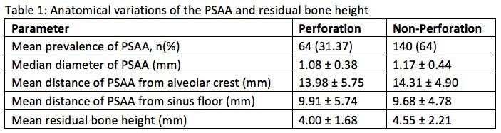 Objectives: Accidental severing of maxillary sinus vasculature, particularly the posterior superior alveolar artery (PSAA), is a common intraoperative complication during lateral sinus augmentation. The hemorrhage may impair surgical field visualization, potentially leading to Schneiderian membrane perforation, the most common surgical complication of the procedure. The aims of this retrospective study were: (1) to assess the prevalence, diameter, and location of the PSAA related to lateral sinus augmentation and (2) to investigate possible associations between anatomical variations of the PSAA and membrane perforations. Methods: Patients who received lateral sinus augmentation at Tufts University School of Dental Medicine from July 1, 2006 to June 30, 2017 with pre-operative cone-beam computed tomography (CBCT) images were included in this study. The CBCT images were analyzed to evaluate possible associations between prevalence of the PSAA, diameter of the PSAA, location of the PSAA, distance of the PSAA from the alveolar crest, distance of the PSAA from the sinus floor, residual bone height, and Schneiderian membrane perforation. Statistical analysis was performed using the independent samples t-test and Wilcoxon rank sum test at P <0.05 level. Results: A total of 204 patients were included in the study. 64 patients (31.37%) had membrane perforation. The PSAA was prevalent in 62.75% of the sinuses on CBCT images and the most frequent location of PSAA was intraosseous (57.0%). Variations in anatomical factors of the PSAA and residual bone height were compared between perforation and non-perforation groups (Table 1). There were no statistically significant differences in prevalence of PSAA, diameter of PSAA, distance of PSAA from the alveolar crest, distance of PSAA from the sinus floor, and residual bone height between the perforation and non-perforation groups. Conclusions: Within the limitations of this study, there were no associations between certain anatomical variations of the PSAA and membrane perforation during lateral sinus augmentation.