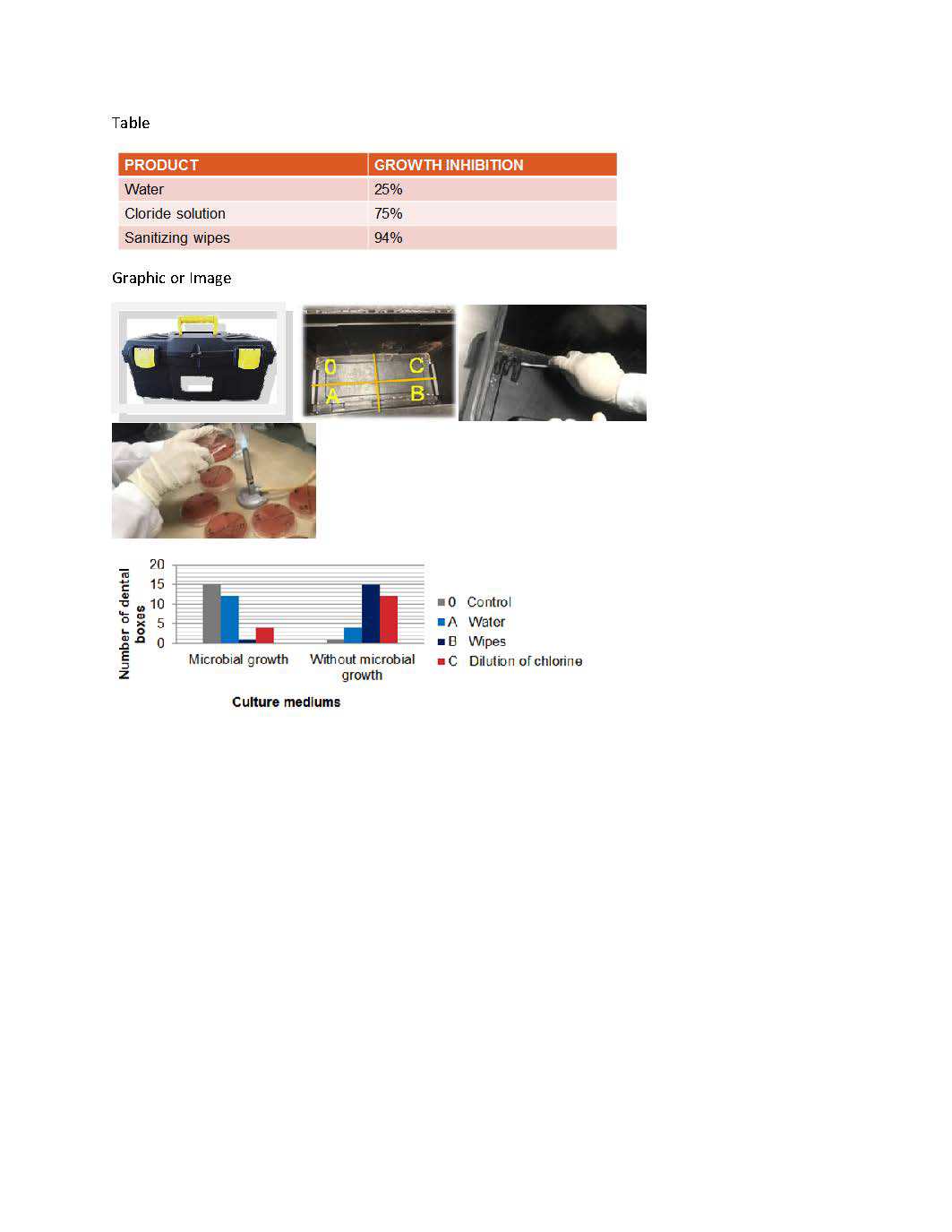 Conclusions: The use of a suitable sanitization method is able to inhibit the microbial growth present in most of the material boxes of dentistry students. Never the less, there were some boxes where it couldn’t be inhibited the microbial growth. Therefore, it is important to advocate efforts at the correct cleaning of box tools that carry the materials to be used with the patients.