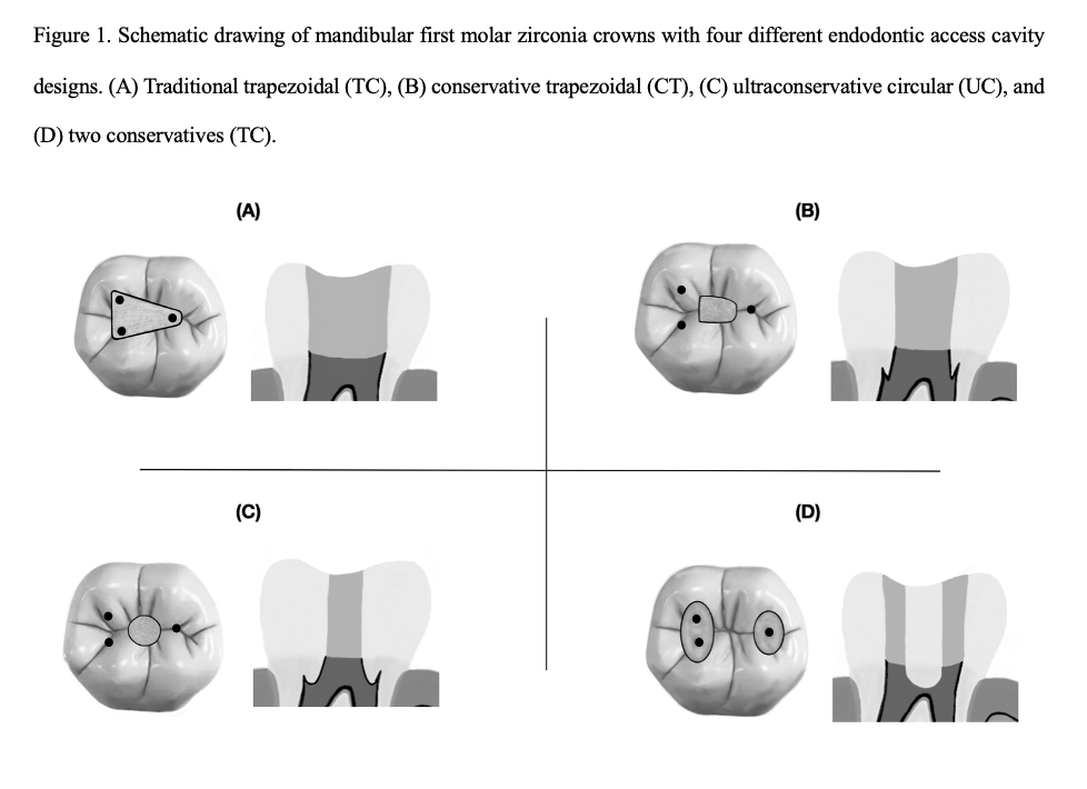 Objectives: This in vitro study aimed to evaluate and compare the fracture resistance of zirconia mandibular molar crowns with the traditional trapezoidal shaped access and three novel conservative access. The designs tested were the traditional trapezoidal (TT), conservative trapezoidal (CT), ultraconservative circular (UC), and two conservative single accesses (TC). Methods: A mandibular right first molar typodont tooth was prepared for full coverage zirconia crown. The preparation was scanned and a total of 56 monolithic zirconia crowns were milled. A printed resin dies was printed for each restoration. Crowns were cemented using to the 3D printed testing dies with dual curing resin cement. The specimens were artificially aged with 10,000 thermal cycles between 5 and 55 C with a dwell time of 30 seconds and were loaded to failure using a universal testing machine. Furthermore, scanning electron microscope images were taken to evaluate fracture patterns of the specimens. The fracture load was analyzed using the Shapiro-Wilks normality test, followed by a one-way ANOVA with a post hoc Tukey test. Results: The fracture resistance of mandibular molar zirconia crowns significantly varied according to the endodontic access cavity design. The highest resistance was displayed with crowns with ultraconservative circular access (2722±113.2 N, p<0.001), followed by the conservative trapezoidal (2469±126.1 N) and the traditional trapezoidal access (1915 ±71.2 N). The lowest value was for the two conservative single access (1064+129.6 N). Conclusions: All endodontic access designs for mandibular molar zirconia crowns appear to resist the average occlusal forces. Crowns with ultraconservative circular access appears to offer the highest fracture resistance among different endodontic access designs. Two single conservative single access in the same crowns significantly diminished the crown’s fracture resistance.