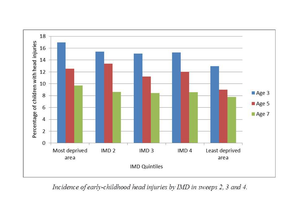 Objectives: Injuries are important causes for children’s morbidity and mortality worldwide. Head injuries are the most prevalent type of injuries during early childhood, and are largely preventable. Evidence regarding the existence of a social gradient is inconclusive. This study aimed to examine if there is a social gradient in early childhood head injuries among UK children at ages three, five and seven. Methods: Data came from the UK Millennium Cohort Study, a UK prospective project that follows the lives of approximately 19,000 children. Logistic regression models were used to examine the association between head injuries and parental social class; household income, maternal education and area deprivation at ages 3, 5 and 7. The sample size for the analysis for each sweep was: 15,382; 15,042 and 13,682 respectively. Results: No linear social gradients were observed for any marker of family socioeconomic position. At ages 3 and 5, head injuries were associated with area deprivation, low income and low social class. At age 7, only area deprivation was weakly related to head injuries. Head injuries were more prevalent among males at all ages. At age 3 and 5 the child’s age was not significant, but at age 7 the association became significant. There was an association between head injuries and the mother’s age at all sweeps. Conclusions: Prevalence of head injuries in early childhood was not socially graded. There appeared to be threshold effects in that children from the most disadvantaged backgrounds were most likely to experience head injuries, however these associations were weak. Potential limitations in relation to data quality will be discussed. These findings suggest that in the aetiology of head injuries, environmental factors such as area deprivation have an important effect in early-childhood head injuries prevalence; suggesting a threshold effect. Therefore socio-demographic determinants should be taken into account.