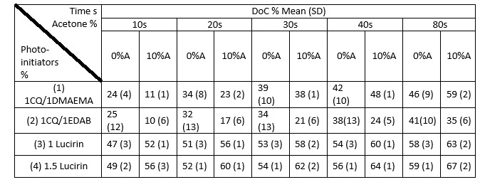 Objectives: White spot lesions are a common complication with orthodontic treatment. We are developing a photo-polymerizing fluoride-releasing orthodontic adhesive. This study aims to investigate the effect of different initiator systems on degree of conversion (DoC) of the developed material. Methods: Sodium fluoride at 10wt% was added to 90wt% polymethylmethacrylate powder and mixed at a powder:liquid ratio of 2:1 with liquid 2-hydroxyethylemethacrylate and methylmethacrylate (40wt%:60wt%), alongside two concentrations of acetone (A-0wt% and 10wt%). Four groups of resin were prepared with varied photo-initiator systems: (1) 1wt% camphorquinone and 1wt% N,N-dimethylaminoethylmethacrylate (DMAEMA); (2) 1wt% camphorquinone and 1wt% Ethyl 4-(dimethyl-amino) benzoate (EDAB) activator; (3) 1wt% diphenyl (2, 4, 6-trimethylbenzoyl) phosphine oxide (Lucirin TPO) and (4) 1.5wt% Lucirin TPO (table 1). FTIR was used to measure DoC for all the materials at 10, 20, 30, 40 and 80s of light curing using Bluephase®20i at 1130mW/cm2. Results: The DoC of group CQ/DMAEMA at 10%Acetone are higher than CQ/EDAB at 30, 40 and 80s (p<0.05). The DC of all groups with Lucirin TPO was higher than groups with CQ initiator system (p<0.05, one-way ANOVA). Conclusions: Lucirin TPO is an effective photo-initiator system which results in higher and faster polymerisation than the CQ system.
