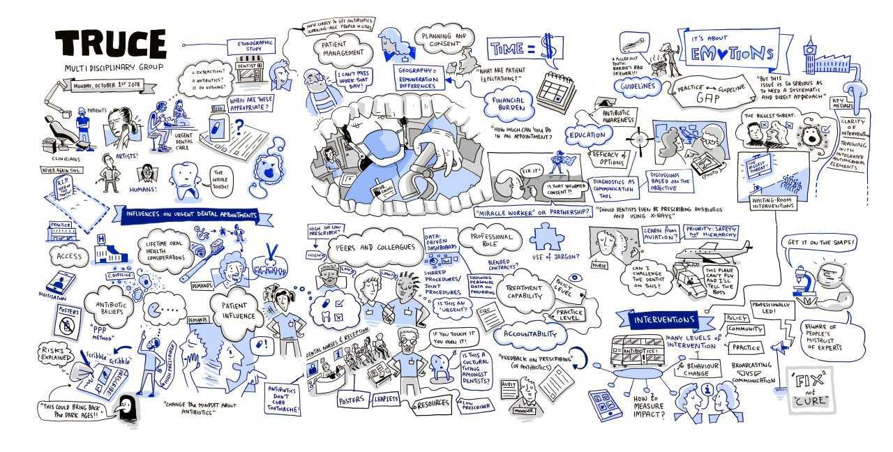 Objectives: My research aimed to develop an evidence-based, theory-informed bundle of interventions to reduce antibiotic prescribing by NHS dentists for patients with toothache and/or infection in England. Methods: First, I explored what influenced treatment (including antibiotic prescribing) during actual urgent dental appointments in high-street practices and out-of-hours clinics. Based on my observations and what patients, dentists and dental nurses later told me by telephone, I produced a list of factors associated with treatment decisions. Next, people with experience of receiving urgent dental care, dental team members and NHS managers worked together to prioritise factors for my future work. Finally, using behavioural science (the Theoretical Domains Framework and the Theory&Techniques of Behaviour ChangeTool), I designed tools aimed at reducing antibiotic prescribing by tackling these priority factors. Results: The bundle of interventions developed included two new communication and engagement tools. One was for use before and during urgent dental appointments, the other was a drama-based tool for engaging a wider audience. Because ‘antibiotic beliefs’ was the only factor found to influence dentists and patients and dental nurses, providing ‘information about consequences’ (a known way to address behaviours driven by 'beliefs and consequences') was at the heart of the communication and engagement tools developed. A selection of other priority factors identified during the research were also included in the intervention design. Conclusions: To slow the spread of antibiotic resistant infections, clinicians are encouraged to use antibiotics only when necessary. Two evidence-based, theory-informed behaviour change interventions have been developed to complement tools already within the UK dental antimicrobial stewardship toolkit.