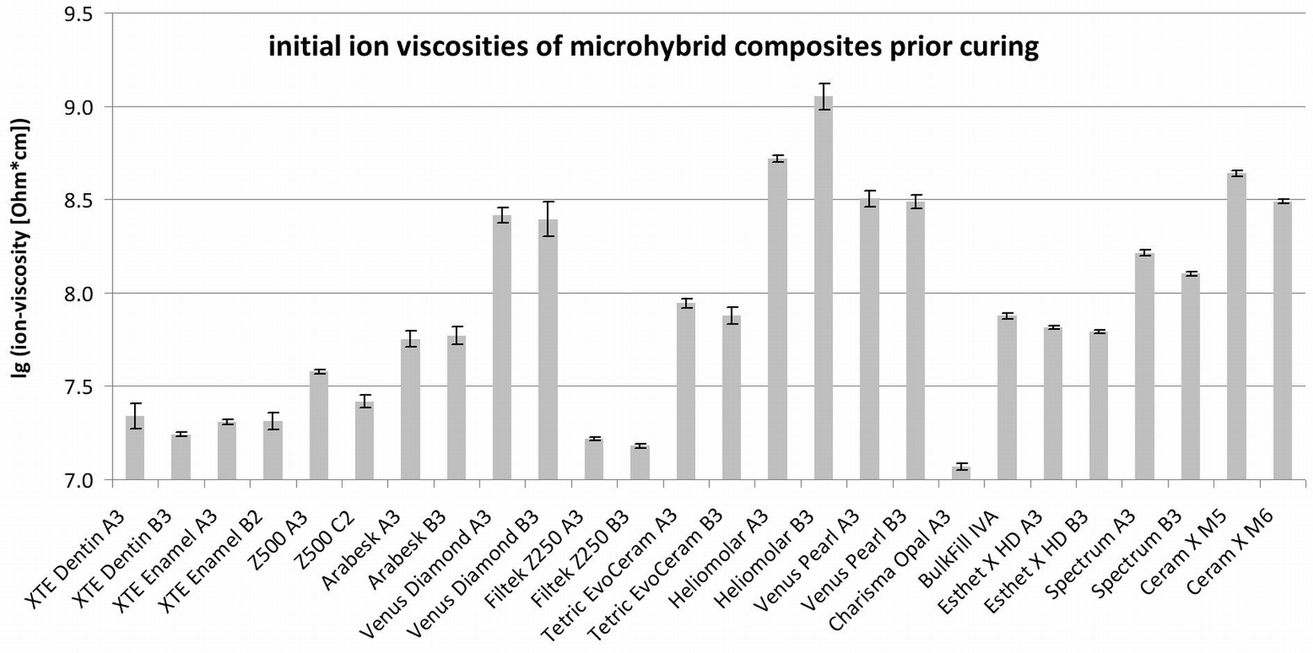 Objectives: Recent publications demonstrated the applicability of dielectric analysis (DEA) for real-time curing monitoring of visible light-curing resin based composites (VLC RBC) to investigate curing kinetics and characterize changes in the resin composition. The aim of this comparative study was to compare the curing behaviour of 26 different VLC RBC (tested also in two different shades) available on the European market using DEA. Furthermore, it was tested if the DEA method is suitable for quality assurance methods by detecting changes in the initial ion viscosity of the different composite types. Methods: A DEA 231 Epsilon with Mini Idex sensors (Netzsch Gerätebau, Selb, Germany) was used to measure the ion viscosity with a frequency of 1,000 Hz at a temperature of 36°C. Every measurement was repeated 5 times (n=5). The initial ion viscosity of the VLC RBC (16 micro-, 7 nano-hybrid-, 2 bulkfill composites and 12 flowables) was measured prior to curing for 1 minute. Then the VLC RBC were cured using a Bluephase 20i in High Modus (Ivovlar Vivadent AG, Schaan, Liechtenstein) for 30s. Results: The investigated VLC RBC can be clearly distinguished from each other with respect to initial ion viscosity (quality assurance application, see figure) by DEA investigation. The analysis of their curing behaviours provides significantly different kinetics parameters with respect to shade (A3 cures faster than B2, B3 or C2) and with respect to monomer composition (RBC containing Bis-EMA cure slower). Data scatter was much lower in the primary curing phase until vitrification than in the highly cured state where there is hardly any ion mobility. In this respect the DEA is a complementary method to the cure monitoring with FT-IR showing high scatter in the primary curing phase. Generally the data scatter increased with the filler content. Conclusions: DEA is a reliable, simple and sensitive method to detect batch variations in the quality assurance of the production of VLC RBC as well as a tool for curing kinetics characterisation of VLC RBC with respect to monomer composition in VLC RBC development.