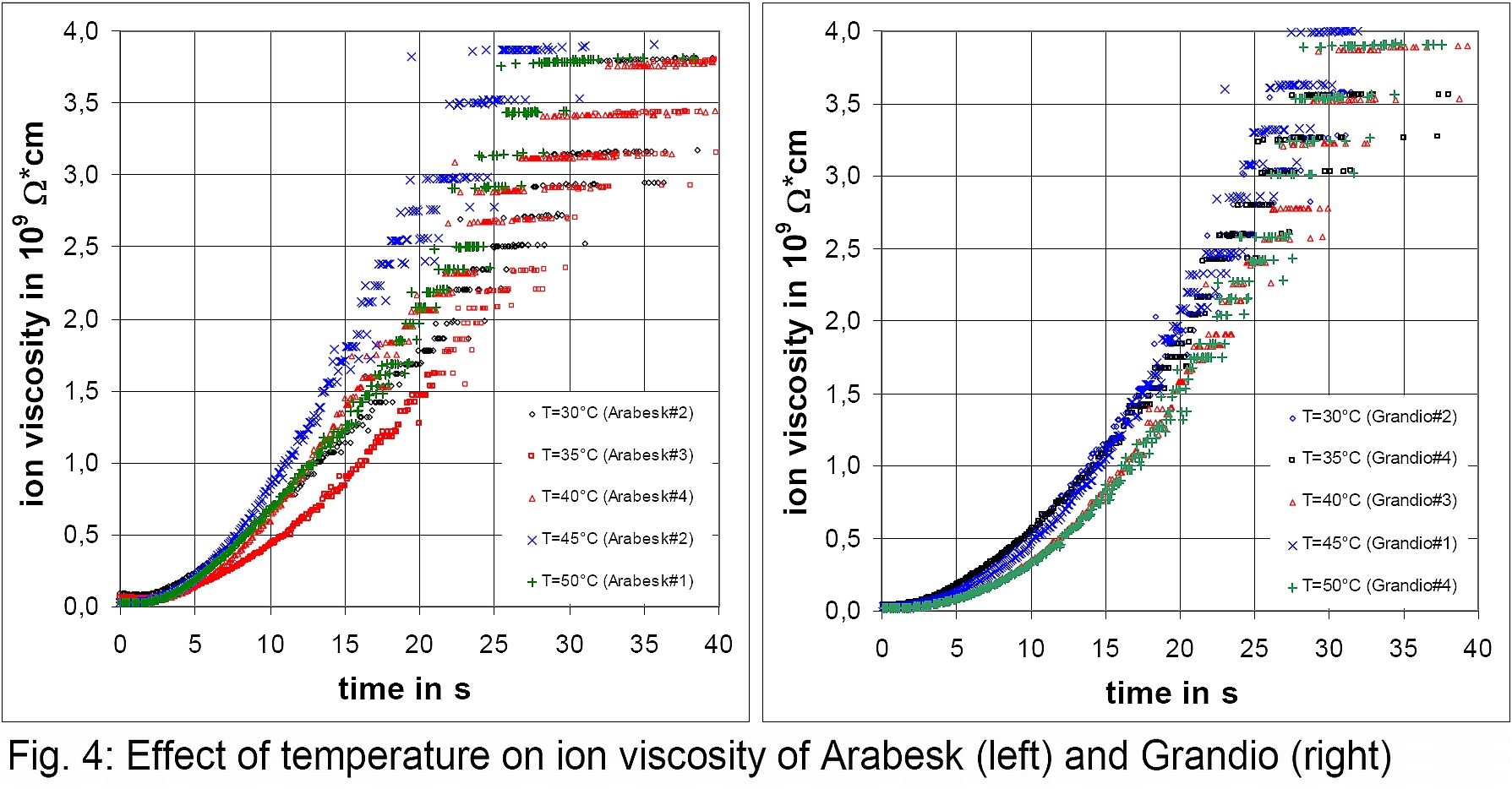 Objectives: Many publications show clearly that temperature affects the final degree of cure (DC) of visible light curing resin based composites (VLC RBC). However, there is a non-uniform situation concerning the temperature dependent reaction rate during the first stages of curing. Some researcher e.g. Daroch et al found a “significant” increase of reaction rate by a factor 1.5 to 2 if the temperature is raised from 20°C to 50°C. Price et al found an increase of factor 1.5 being a not significant (p=0.16). These small changes are surprising as the viscosities of TEGDMA-BisGMA based resins change typically by a factor 5 to 10 leading to the conclusion that the reaction rate should correspondingly increase due to the higher molecular mobility. Methods: DEA has a good time resolution of 10 to 20 data points per second if a frequency of 1,000 Hz is used and was thus applied to investigate the reaction kinetics using a Netzsch DEA 231. The investigated VLC RBC were camphorquinone initiated Arabesk Top OA2 and Grandio, VOCO, Germany. Results: It was found that there is almost no significant temperature dependency of both reaction rate and initiation time during the phase of primary curing in the temperature range 30 to 50°C. This can be explained either by the low activation energy of 20 kJ/mole for photo-initiation or by the assumption that the rate of radical annihilation increases in a way that compensates for the viscosity decrease. Conclusions: For dentists this is in principle good news as they need not to bother much about the temperature effects on reaction rate of VLC RBC if it is camphorquinone initiated.