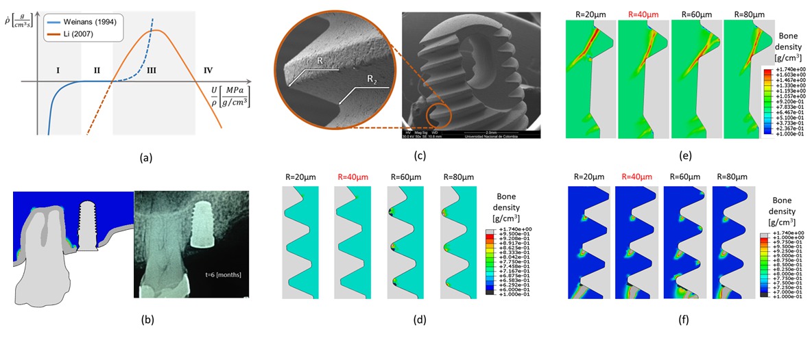 Objectives: Identify the effect of the thread rounding radius on bone density changes around dental implants through FEA. Methods: Bone remodeling is a complex process which involves a coordinated action between cells, biochemical factors and extracellular matrices. Bone adapts to mechanical loading, thus based on the models developed by Weinans (blue in figure 1.a) and Li (orange in fig. 1.a), we have implemented a new model (continuous line in fig.1.a) that predicts bone density changes (ρ″) in response to mechanical stimulus (U/ρ), taking into account an underload resorption zone (I), a lazy zone (II), a bone-growth zone (III) and an overload resorption zone (IV).