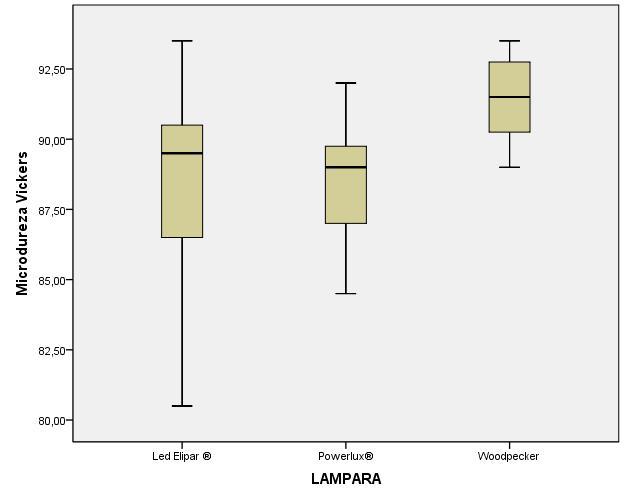 Conclusions: The composites used in this in vitro study showed an acceptable microhardness above the required standards (> 80HV) after the photopolymerization with the three lamps: Elipar®, Powerlux® and Woodpecker®. However, the Woodpecker® lamp provided higher values of microhardness vickers, compared to the other two lamps. The results showed a statistically significant difference between woodpecker® and the other two lamps. The Lower cost lamps show a similar behavior to the highlight lamp.