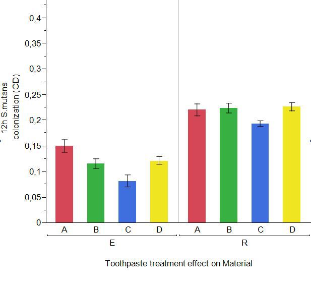 Objectives: The aim of this study was to evaluate in vitro the effect of toothpaste formulations containing hydroxyapatite nano-particles on enamel and composite early colonization and biofilm formation by mixed plaque flora and by S. mutans using both a microtiter plate model and a MDFR. Methods: A total of 128 enamel disks obtained from anterior human teeth and 128 disks with the same dimensions were obtained from a nanohybrid resin-based composite (RBC, Clearfil Majesty ES-2, shade A2, Kuraray Europe GmbH, Hattersheim am Main, Germany). Three toothpaste formulations were analyzed both on enamel and composite specimens: A) Toothpaste without active principle; B) Toothpaste containing hydroxyapatite nano-particles (Biorepair® Protezione Totale, Coswell, Italy); C) Toothpaste containing Mg-Ca-Sr biomimetic hydroxyapatite (Biosmalto®, Curaden Healthcare Spa, Italy). A control group (D) has been prepared for comparison. The specimens were placed in the MDFR device and then incubated at 37°C for 24 h in clarified saliva. In parallel, it was decided to carry out additional experiments developing mixed plaque and monospecific Streptococcus mutans biofilms inside microtiter plates, under static conditions. Results: Enamel surfaces were generally less colonized than the RBC counterparts (p<0.0001). In particular, Group C was significantly less colonized than the control on both surfaces (p<0.0001). No significant differences were found between Group B and the control (p=0.8804 and p=0.6892 for RBC and enamel surfaces, respectively). and between Group A and the control on RBC surfaces (p=0.6855). Conclusions: The fact that S. mutans has more affinity for RBC surfaces than for enamel is very interesting since it may be related to secondary caries occurrence. It is therefore unexpected but of primary importance the fact that a toothpaste treatment may have an influence on RBC surfaces in addition to the natural ones, since this may allow the prevention of secondary caries in addition to primary caries prevention by a toothpaste treatment.